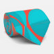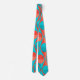Esta corbata tiene un diseño de arte deco de círculos naranjas y verde azulados de dos tonalidades dentro de triángulos verde azulados y naranjas de dos tonos.