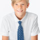 Una elegante corbata de patrón religioso que tiene como patrón una cruz de lámina de plata falsa sobre fondo azul clásico, recomendada para la primera comunión de un niño o confirmación religiosa.