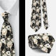 Una corbata con estampado floral en acuarela en negro y blanco presenta un diseño elegante y sofisticado con flores de diversas formas y tamaños, contrastadas con un fondo negro o blanco. Los motivos florales son intrincados, con los pétalos, hojas y tallos representados con líneas limpias y sombreado. El diseño varía desde flores grandes y audaces hasta flores más delicadas y pequeñas, creando una apariencia equilibrada y dinámica.
