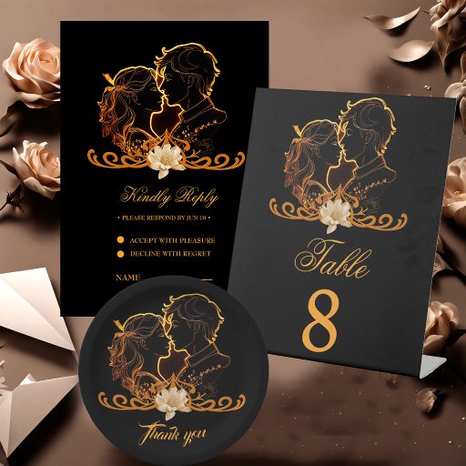Diseño misterioso y elegante en oro y negro. La combinación de oro y negro crea un equilibrio armonioso entre elegancia y modernidad que atrae la atención de los clientes y los prepara para la próxima celebración.