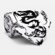 The image showcases a bold monochrome dragon pattern set against a deep black background. Four stylized tribal dragons are positioned in a circular arrangement, each rendered in dark gray with sharp curves, sweeping tails, and intricate flame-like details. The symmetrical layout creates a balanced, emblem-like composition with strong negative space in the center. The dragons feature fierce profiles, curved horns, and flowing ornamental lines, giving the design a powerful, mythical, and slightly gothic aesthetic. This striking dragon motif is ideal for apparel graphics, tattoo inspiration, gaming artwork, branding elements, or decorative surface design.