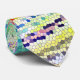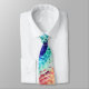 Una pluma de pavo real geométrica detalla un dibujo colorido en una corbata.