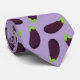 Vibrant purple tie patterned with purple aubergine eggplant vegetables on a soft lilac background colour