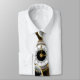 Composición de reloj de vapor redondo con dial numérico romano negro, decorado con arcos de oro y latón, mariposas morfo azules y lentes dañadas sobre fondo rayado marrón. Estilo Steampunk.