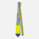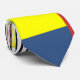 Esta corbata tiene un diseño de líneas negras rotas que corren verticalmente en rectángulos de azul claro, verde, azul y amarillo.