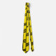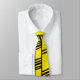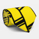 Esta corbata tiene un diseño art deco de líneas verticales negras con líneas diagonales negras que las conectan en un campo de amarillo.