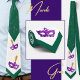 Dos máscaras muy elegantes en polvo violeta/morado con una decoración de pluma amarilla naranja brillante adornan esta corbata sutil y elegante de Mardi Gras.