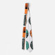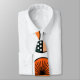 Este empate tiene un diseño moderno de mitad de siglo de círculos verde azulados y naranjas con medio estallido en algunos y pequeños círculos repetitivos en otros.