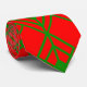 Esta corbata tiene un diseño art decó de formas de diamante, y líneas en verde en un campo de rojo.