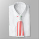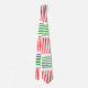 Esta corbata tiene un diseño moderno de mediados de siglo que se parece a un tejido de líneas rojas y verdes en un campo de blanco.