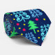 Árboles navideños verdes, azules y turquesas con nieve amarilla y roja sobre fondo azul oscuro.