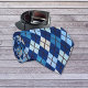 Patrón argyle azul con colores predominantes de azul oscuro y azul claro, luego un verde azulado oscuro y claro, y luego el color beige claro.