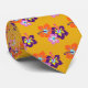 Pequeña corbata de patrón floral, de color dorado, con flores de hibisco tropical impreso. Las flores moradas y naranjas hacen un accesorio agradable para cualquier verano, o la playa, boda.