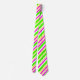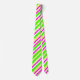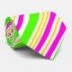 Esta corbata tiene rayas brillantes de anchura variable (verde limón, magenta, amarillo y blanco) dispuestas en un patrón diagonal.