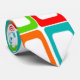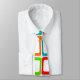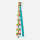 Esta corbata tiene un diseño moderno de mediados de siglo de repetición de rectángulos sesgados en rojo, naranja, verde y turquesa.