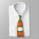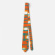 Esta corbata tiene un diseño moderno a mediados de siglo de rectángulos naranjas con círculos blancos y dorados en ellos y líneas horizontales verde azuladas que los atraviesan en un campo de verde azulado.