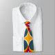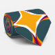 Este corbata tiene un diseño moderno de mediados de siglo de círculos concéntricos en los colores de los años 70 con estrellas entre cada grupo.