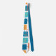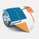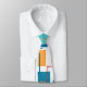 This necktie has a geometric design of squares in coral, orange, yellow, and blues scattered about with their outlines.