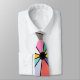 Esta corbata tiene un diseño abstracto hecho de nueve cuadrados con un círculo y "rayos" saliendo del círculo en muchos colores diferentes.