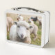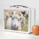 Esta caja de almuerzo tiene un lindo cordero retratado en ella.
