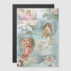 Encantador collage de hermosos ángeles victorianos, pinos cubiertos de nieve, rosas, holly, música de Navidades, tipografía, evergreens y paisajes rurales rústicos rodeados de delicados filigres blancos sobre fondo azul cielo claro.
