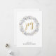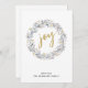 Una tarjeta de vacaciones moderna presenta una corona hecha de botánicas invernales en acuarela con alegría en el centro en tipografía de guión dorado. Personaliza con tu nombre.