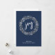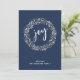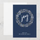 Una tarjeta de vacaciones moderna azul presenta una corona hecha de botánicas de invierno de acuarela con alegría en el centro en tipografía de escritura blanca. Personalice con su nombre.