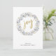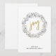 Una tarjeta de vacaciones moderna presenta una corona hecha de botánicas de invierno de acuarela con alegría en el centro en tipografía de escritura dorada. Personaliza con tu nombre.