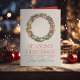Corona brillante sobre fondo beige blanquecino con "saludos de la temporada" y nombre del negocio y año. Opción para un mensaje interno y una foto.