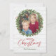Enmarca tu foto favorita con una encantadora corona de acebo sobre un fondo de madera blanca. Esta tarjeta de Navidad rústica deleitará a familiares y amigos. Las tablas también se muestran en la parte posterior con un espacio opcional para un mensaje o resumen del año.