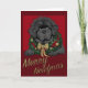 Hermosa tarjeta de felicitación con un perro cachorro de Terranova dibujado y coloreado a mano con una corona en la parte delantera con un tema rojo y dorado, "¡Feliz Newfmas!"