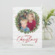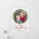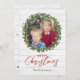 Enmarca tu foto favorita con una encantadora corona de acebo sobre un fondo de madera blanca. Esta tarjeta de Navidad rústica deleitará a familiares y amigos. Las tablas también se muestran en la parte posterior con un espacio opcional para un mensaje o resumen del año.