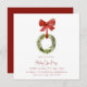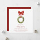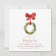Una invitación de corona de Navidad con lazo rojo colgante para casa abierta en festejos. Esta invitación de fiesta de Navidad presenta una corona de Navidad de follaje con un lazo rojo. Todo el texto se puede personalizar con cualquier redacción de su elección.