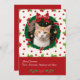 Tarjeta de saludo de Navidad festiva y personalizada para mascotas con una corona verde y roja sobre un fondo de hojas y bayas de acebo. Reemplaza la imagen del gato en la corona con una foto de tu gato o perro. También funcionaría muy bien con una imagen de tu hijo o una foto familiar. El mensaje en la parte posterior de la tarjeta se puede cambiar fácilmente a cualquier saludo que desees.