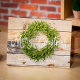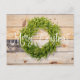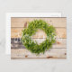 El diseño está compuesto por una exuberante corona de follaje verde sobre un fondo de madera natural con un saludo festivo escrito en tipografía de letra cursiva juguetona. Agrega una foto personalizada dentro.