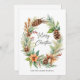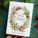 Tarjeta de felicitación de corona de Navidad con piñas bayas y follaje.