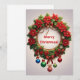 Corona de Navidad brillante y alegre adornada con poinsettias vibrantes, adornos brillantes, copos de nieve y cintas en un fondo cálido y suave que simboliza la alegría y las celebraciones navideñas.