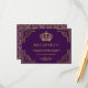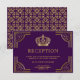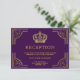 Tarjeta de recepción elegante con un borde ornamentado dorado elegante y una hermosa corona contra un fondo púrpura oscuro.