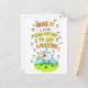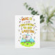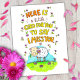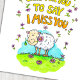 El fondo de esta tarjeta es blanco. De arriba hacia abajo está escrito "Acá hay una pequeña carta para que digas que te extraño". Las letras son dibujadas a mano, amarillas y naranjas. Las palabras están enmarcadas con pequeñas flores rosadas y violetas. Debajo de ellos está el dibujo de una linda oveja, dibujada al estilo personalizado. Tiene una flor rosa en la boca y sonríe al espectador. Está situado en un campo de hierba verde con flores rosadas. Detrás de la oveja, se ve un cielo azul.