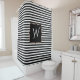 Cortina de ducha monogramada de moda con rayas horizontales en blanco y negro. Un área de texto decorativo negro, en medio de la cortina, tiene un monograma blanco de una sola letra listo para personalizar. Hay productos que coinciden.