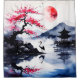 Step into tranquility with this elegant landscape featuring a white crane poised at the water’s edge beneath blooming pink blossoms. Misty mountains rise in the distance, while a traditional pavilion floats gently over the calm lake. A glowing red sun (or moon) anchors the sky, casting warmth across the scene. This piece blends cultural symbolism with meditative beauty—perfect for wall art, tapestries, or decor that invites peace and reflection.