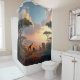 Un sereno paisaje de sabana africana está bañado en cálidos tonos de puesta de sol, con elefantes y jirafas que deambulan pacíficamente entre árboles de acacia. Nubes esponjosas puntean el cielo, agregando profundidad y contraste a la dorada escena.