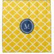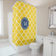 Cortina de ducha adaptable del modelo del enrejado del quatrefoil del monograma en amarillo de la mostaza, azules marinos oscuros y blanco.