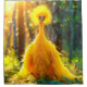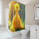 Esta cortina de ducha tiene un gran ave de dinosaurio amarillo.