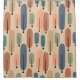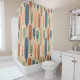 Esta cortina de ducha tiene un diseño moderno de mediados de siglo de largos óvalos en melocotón, verde, azul, verde azulado y marrón claro con líneas negras con círculos en los extremos.