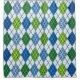 Esta cortina de ducha tiene un diseño art deco de formas diamantíferas hechas de ángulos superpuestos en líneas negras coloreadas en tonos azules y verdes con líneas negras diagonales haciendo que el diseño parezca estilo de argyle