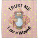 Viejo mago con capa rosa mirando la bola mágica de cristal.