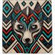 Se trata de una cara decorativa de lobo hecha a mano y estilizada con estampados aztecos en colores negro, rojo, turquesa y beige.