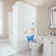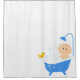Pequeña huella para una ducha de bebé con temática masculina. Niño pequeño sentado en una bañera azul con burbujas y su pato de goma.