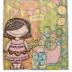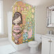 Una bonita cortina de ducha veraniega con un fondo marrón, rosa y verde con muchos limones y lonchas de limón, un chica de pelo marrón vestido de rosa, una gran jarra de limonada rosa y un vaso de limonada con paja y cubos de hielo.